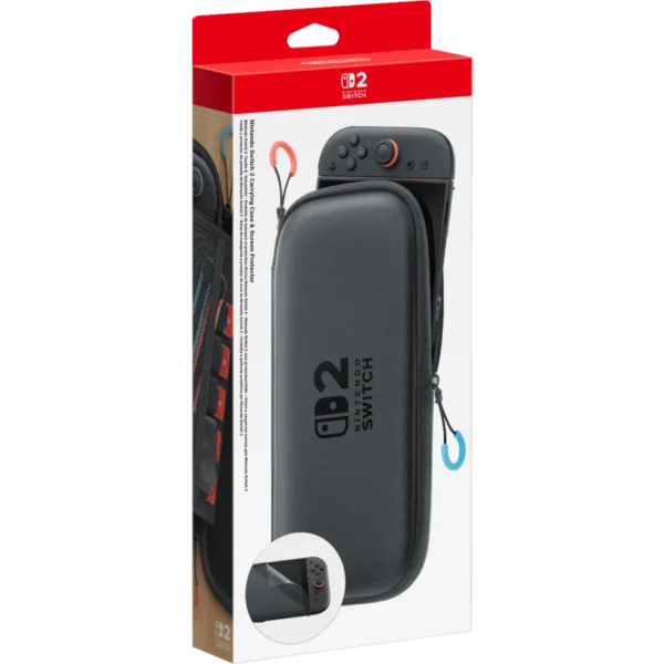 Proteggi la tua console Nintendo Switch 2 con questa elegante e robusta custodia, che include anche una pellicola protettiva e un panno per la pulizia. Può ospitare fino a sei schede di gioco e due laccetti per Joy-Con 2.